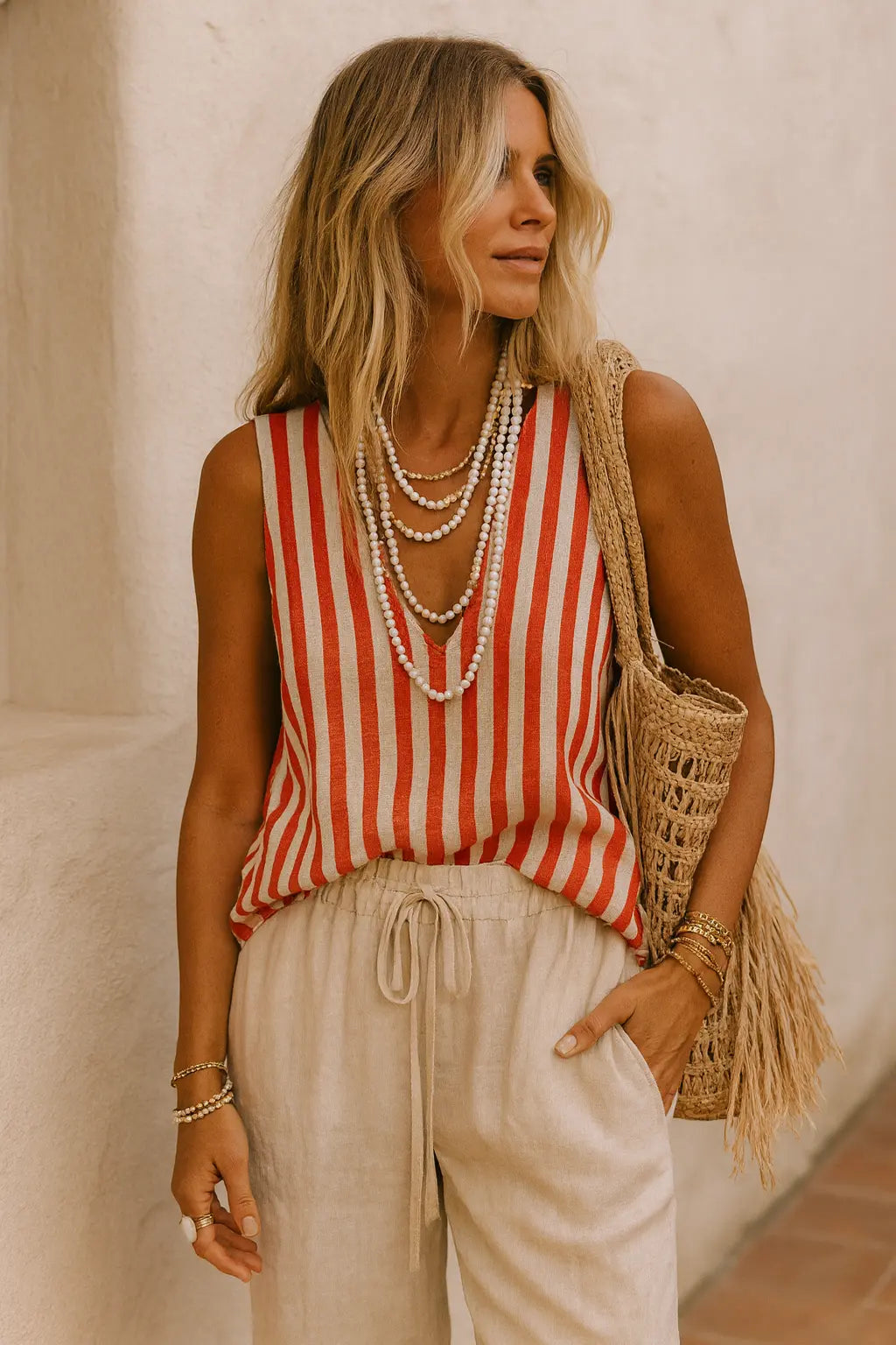 The Alma Pure Nature Linen Striped Sunset Tank Top is a stylish and breezy piece perfect for warm weather. Made from soft, breathable linen, it features a vibrant striped pattern reminiscent of a sunset. Its relaxed fit and lightweight design ensure comfort and a chic, laid-back look.
