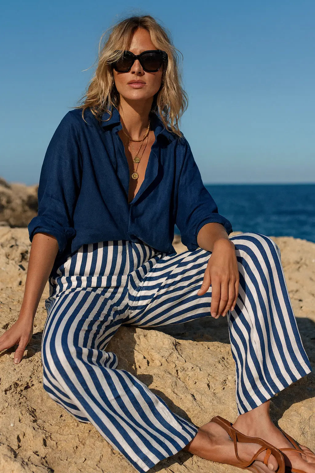 The MOV Pure Natural Linen BlueBliss Stripe Printed Pant offers a blend of comfort and elegance with its breathable natural linen fabric. Featuring a stylish blue stripe print, it's perfect for casual outings or relaxed office wear. These pants combine timeless design with sustainable craftsmanship.