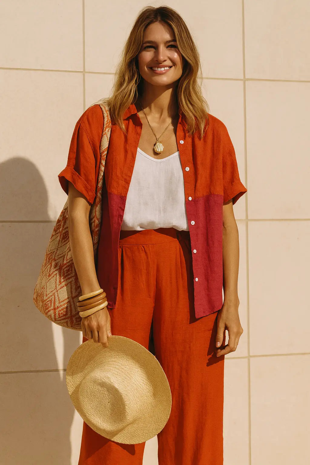 The VIVA Pure Natural Linen Color Block Co-Ord Set is a stylish and comfortable outfit made from high-quality natural linen fabric. Featuring a modern color block design, it effortlessly combines casual elegance with a trendy vibe. Perfect for warm weather, this set offers a relaxed fit with a flattering silhouette for everyday wear.