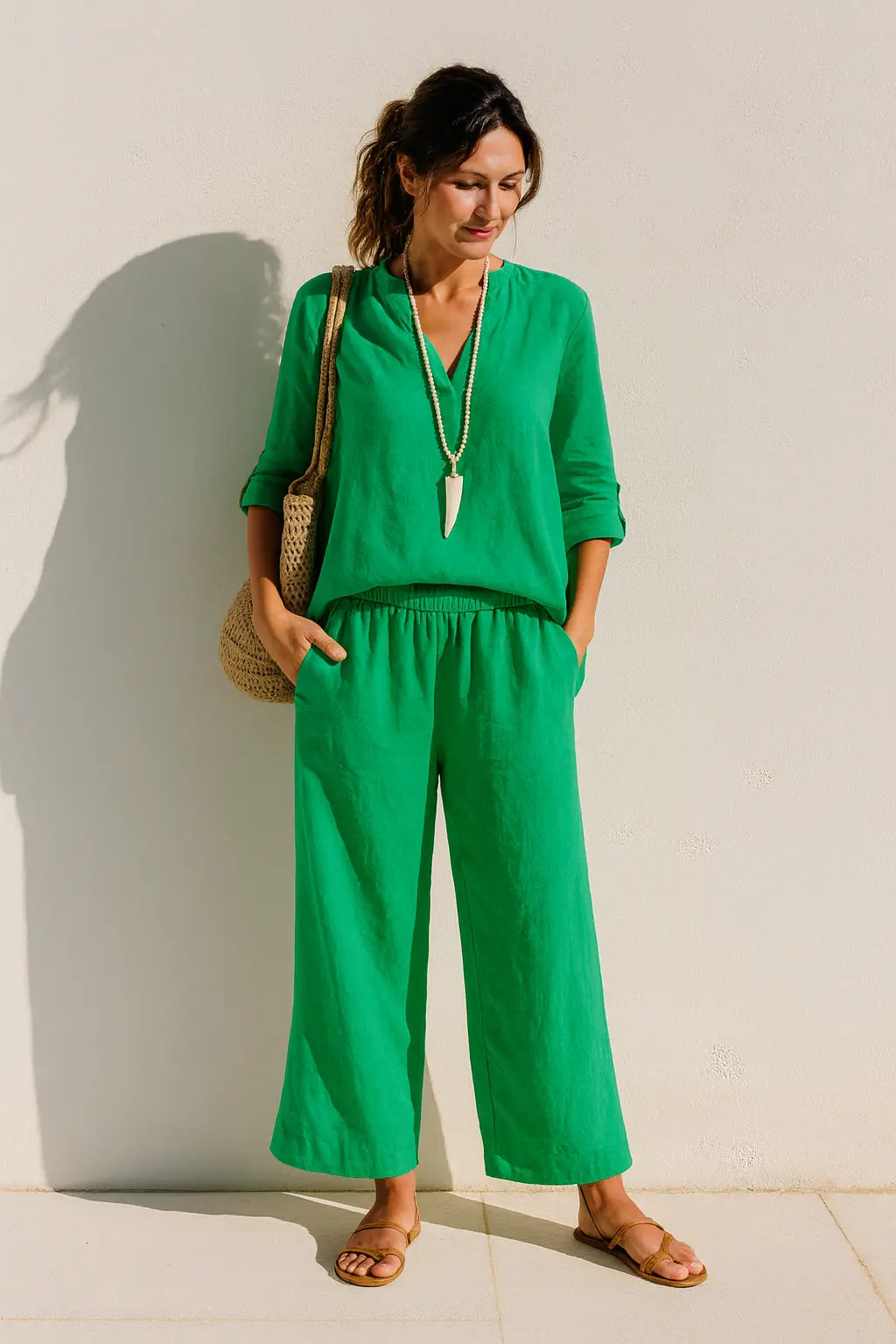 • The Lucia Pure Natural Linen Co-ord Set offers a chic, breathable design crafted from premium natural linen. Featuring contrasting colors, this set combines style and comfort, making it perfect for casual outings or relaxed get-togethers. Its versatile pieces can be mixed and matched, adding a touch of sophistication to any wardrobe.