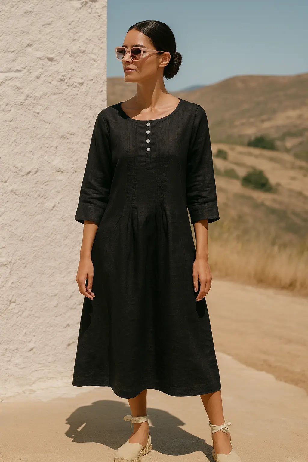The Isla Pure Natural Linen Solid Color Pleated Dress is a timeless piece crafted from soft, breathable linen fabric. Its elegant pleats add texture and movement, while the solid color offers versatility for various occasions. Perfect for effortless, stylish dressing in warm weather.