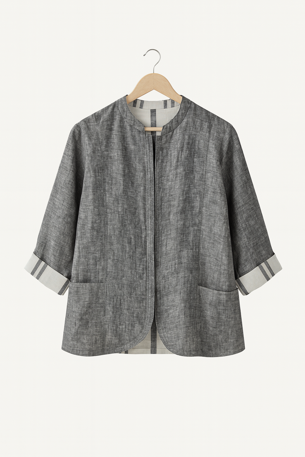 Experience the pinnacle of understated luxury with our Reversible Luxe Linen Jacket. Meticulously crafted from high-quality natural linen, this adaptable garment offers two distinct styles: the casual, artisanal striped side and the sleek, refined smooth finish for a sophisticated, modern look. Featuring a relaxed fit, a streamlined button-front closure, and spacious utility pockets, this jacket seamlessly combines practicality with elegance. The lightweight, breathable linen is ideal for layering throughout the seasons, and the subtle neutral tones allow for effortless coordination with everything from tailored linen trousers to relaxed weekend jeans. An essential addition to any wardrobe—sustainable, chic, and versatile.